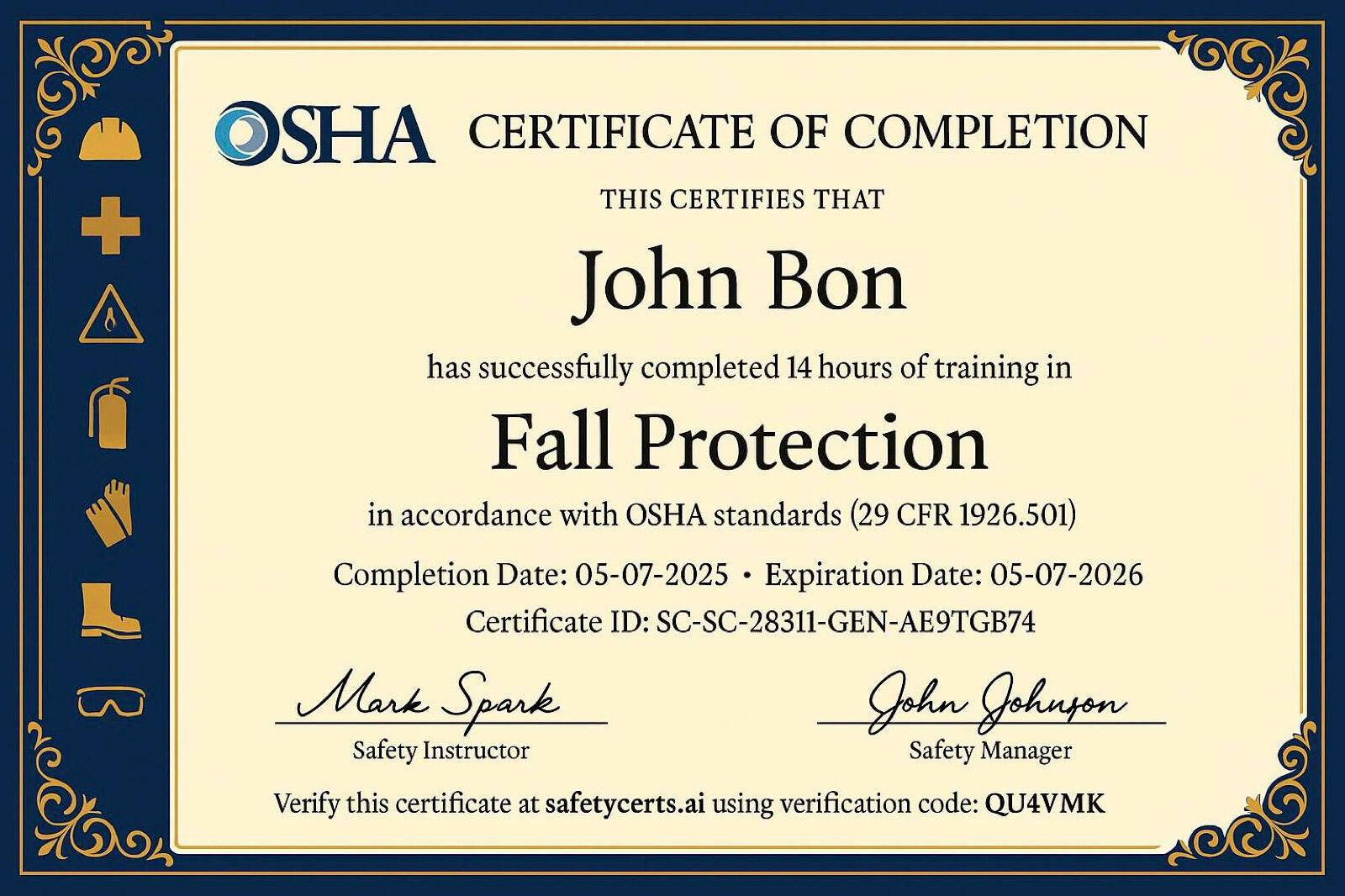 The only certificate platform built specifically for OSHA compliance:Cuts certificate creation time by 90%Provides OSHA-specific templates for all required safety certificationsSimple verification process allows inspectors to quickly check if the certificate is realCreates professional certificates with no design skills required